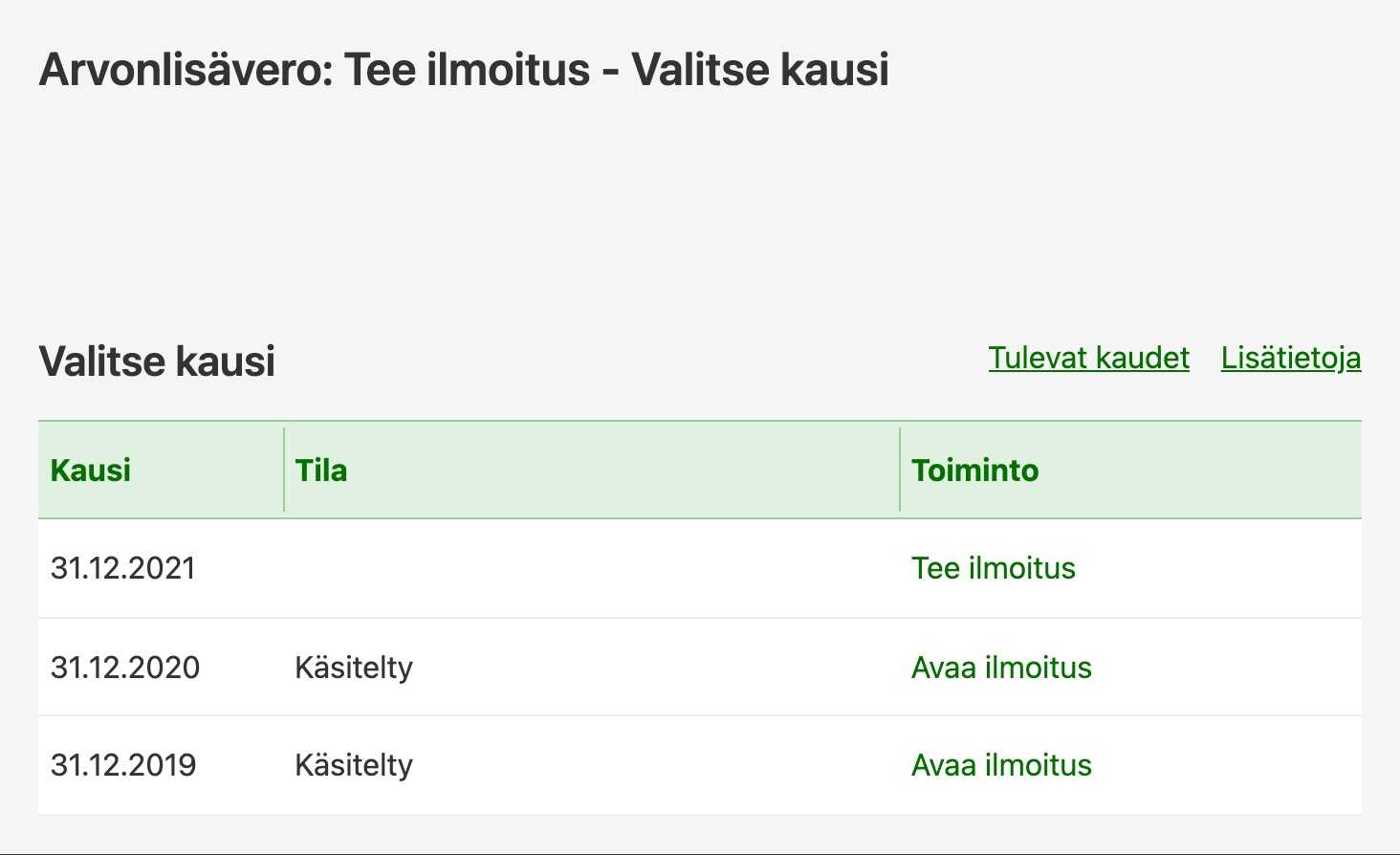 - Valitse oikea kausi, jonka tietoja olet antamassa. Jos sinulla on useita avoimia kausia, niiden kaikkien tiedot tulee antaa niin kauan kuin Y-tunnuksesi on alv-rekisterissä. Klikkaa "Tee ilmoitus".