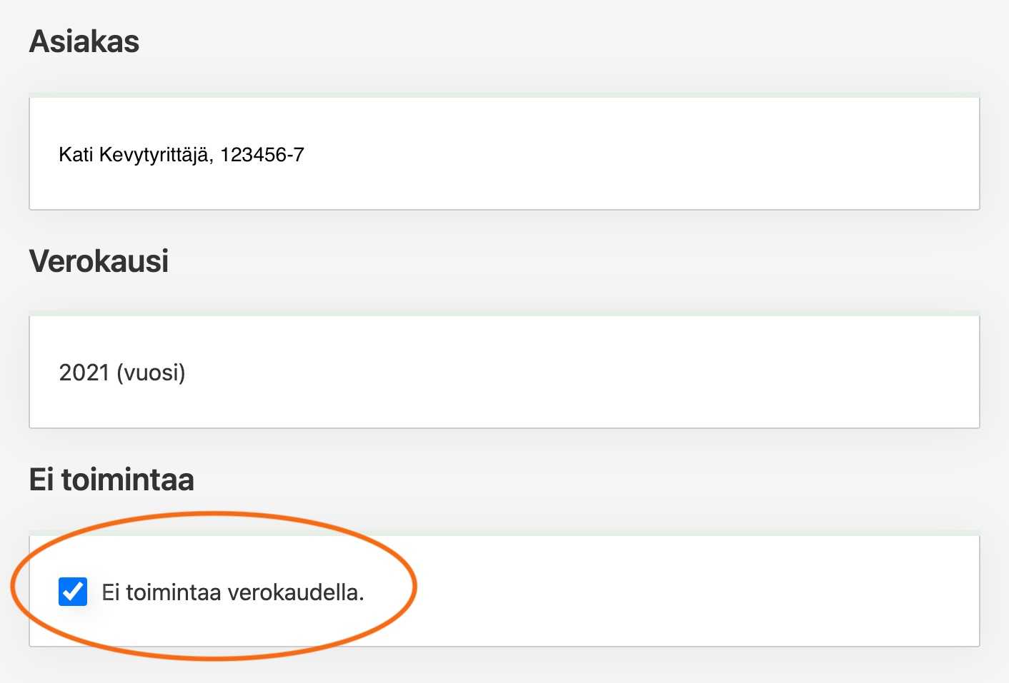 - Valitse täppä "Ei toimintaa verokaudella".