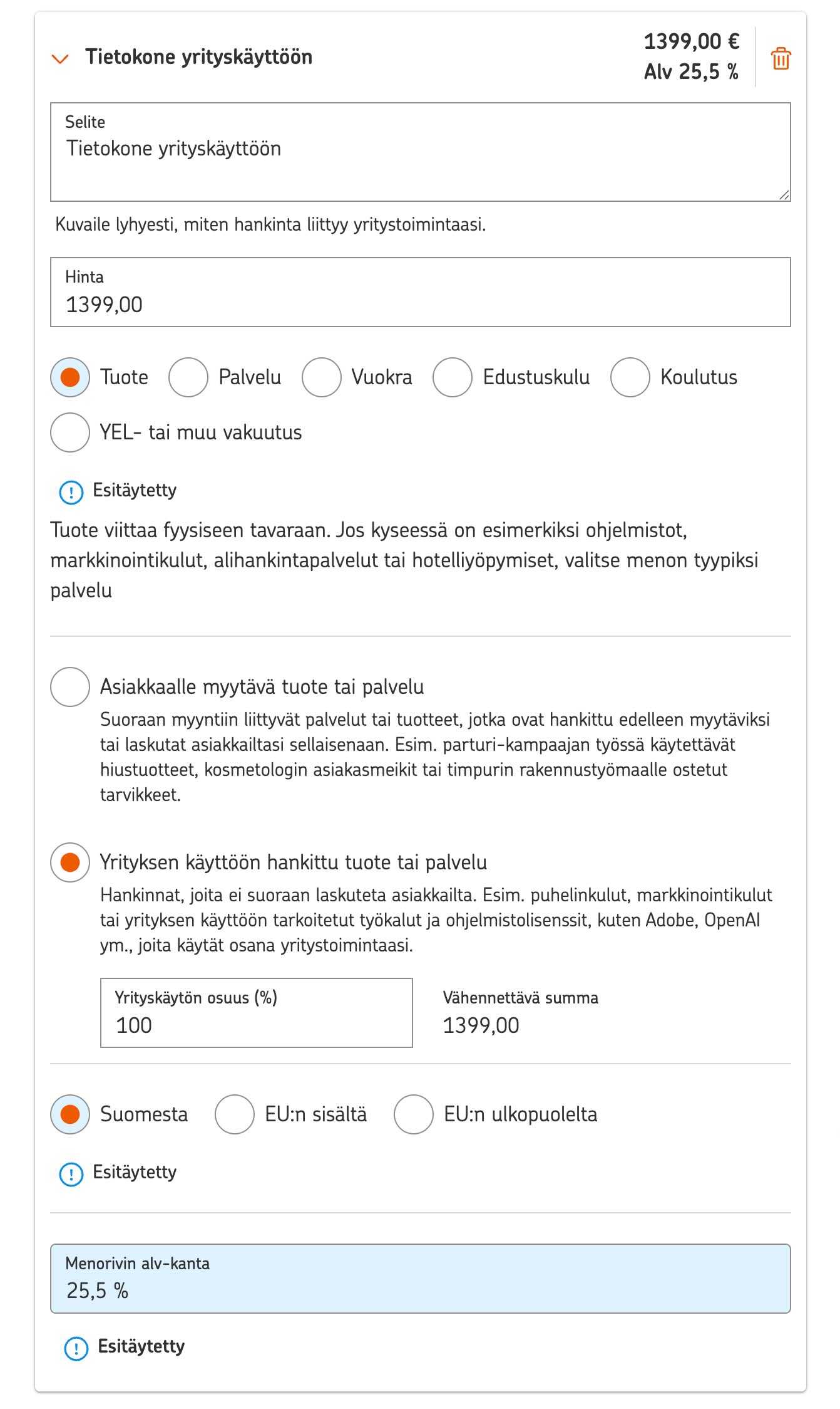 • Asiakkaalle myytävä tuote tai palvelu: Myyt ostamasi tuotteen tai palvelun edelleen asiakkaalle. Jos käytät tuotteita palvelun yhteydessä tai jälleenmyyt tuotteet asiakkaillesi osana valmista tuotetta/palvelua tai erikseen, valitse niihin menoihin aina tämä valinta.